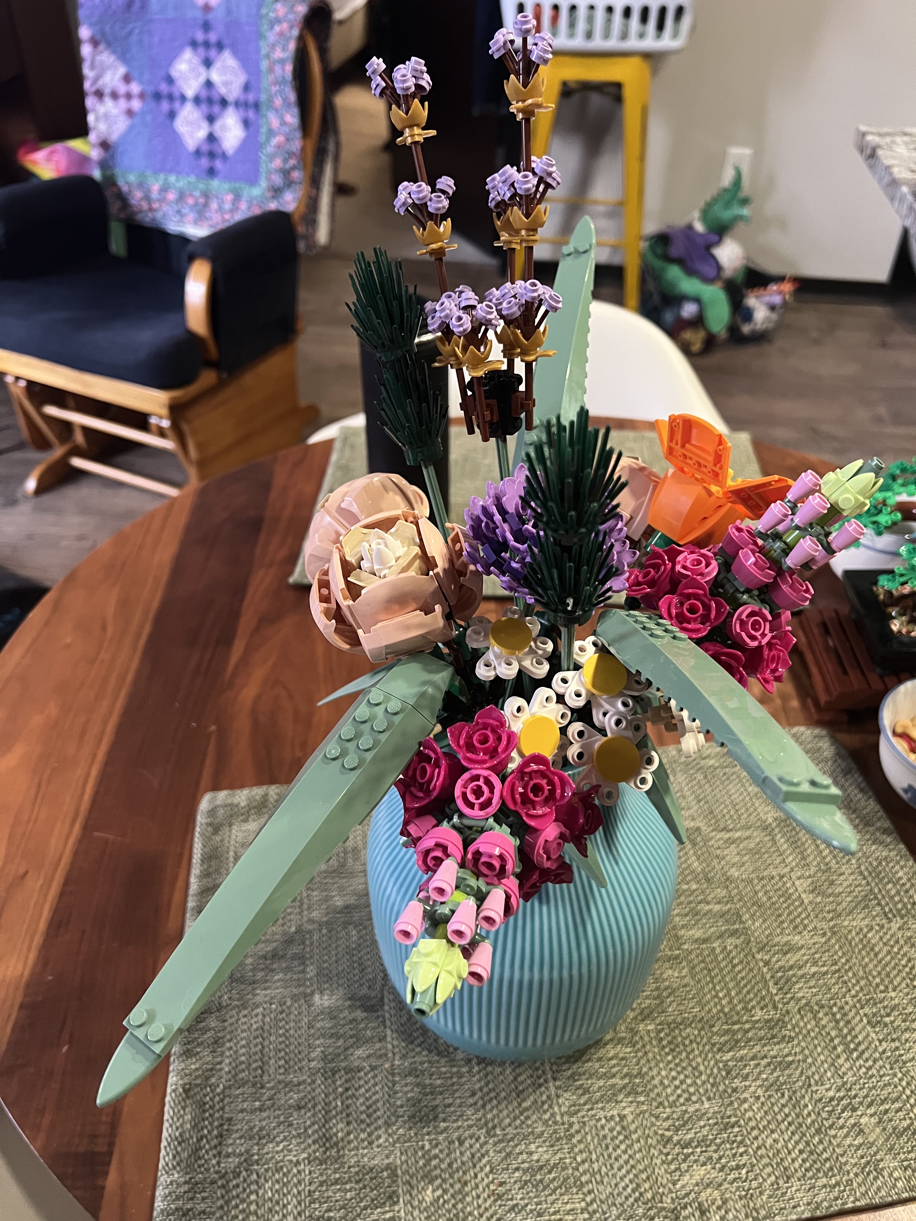 The bouquet was a surprise gift from a friend, and was a delight to put together. My husband built the bonsai tree and the T-Rex, and I built the rest. This has been a really great way to keep my hands and brain busy, so I ended up ordering a couple of additional sets, which should get here today!